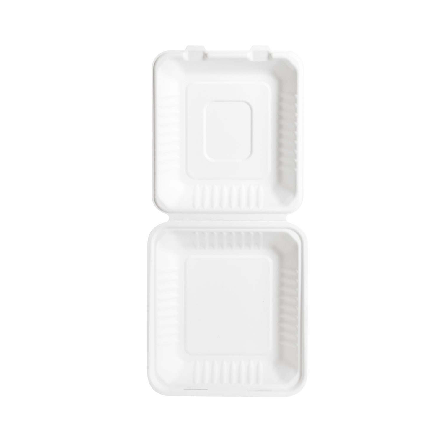 8 inch White Bagasse Clamshell Containers, 200 pcs - 8"x8"-200 / 1 compartment is backordered and will ship as soon as it is back in stock.