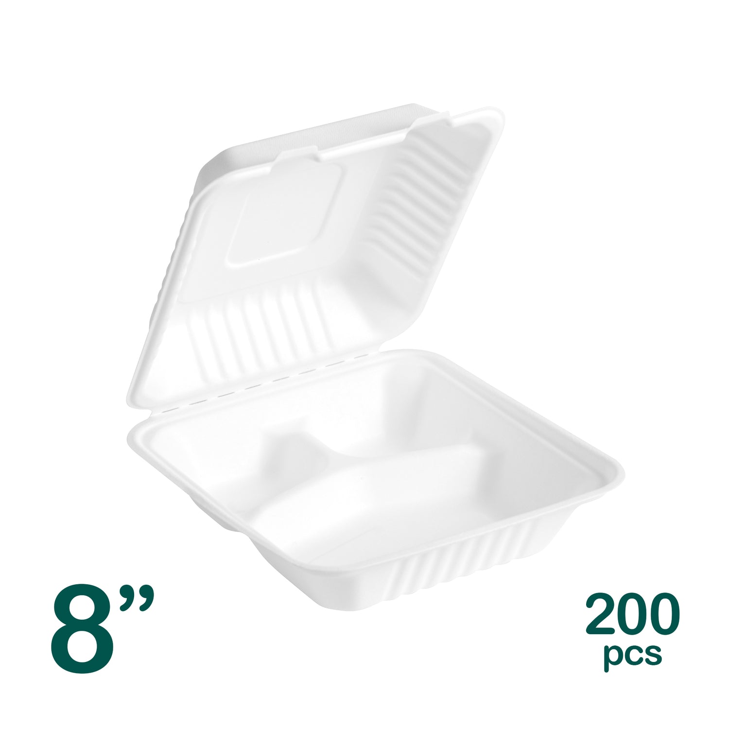 8 inch White Bagasse Clamshell Containers, 3 Compartment, 200 pcs