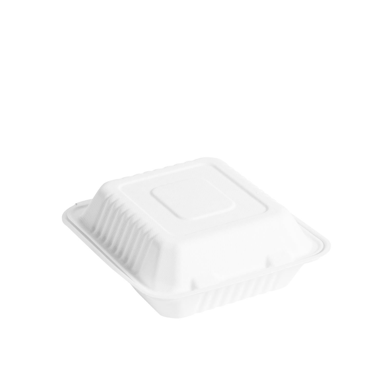 8 inch White Bagasse Clamshell Containers, 3 Compartment, 200 pcs - 8"x8"-200 / 3 compartment is backordered and will ship as soon as it is back in stock.