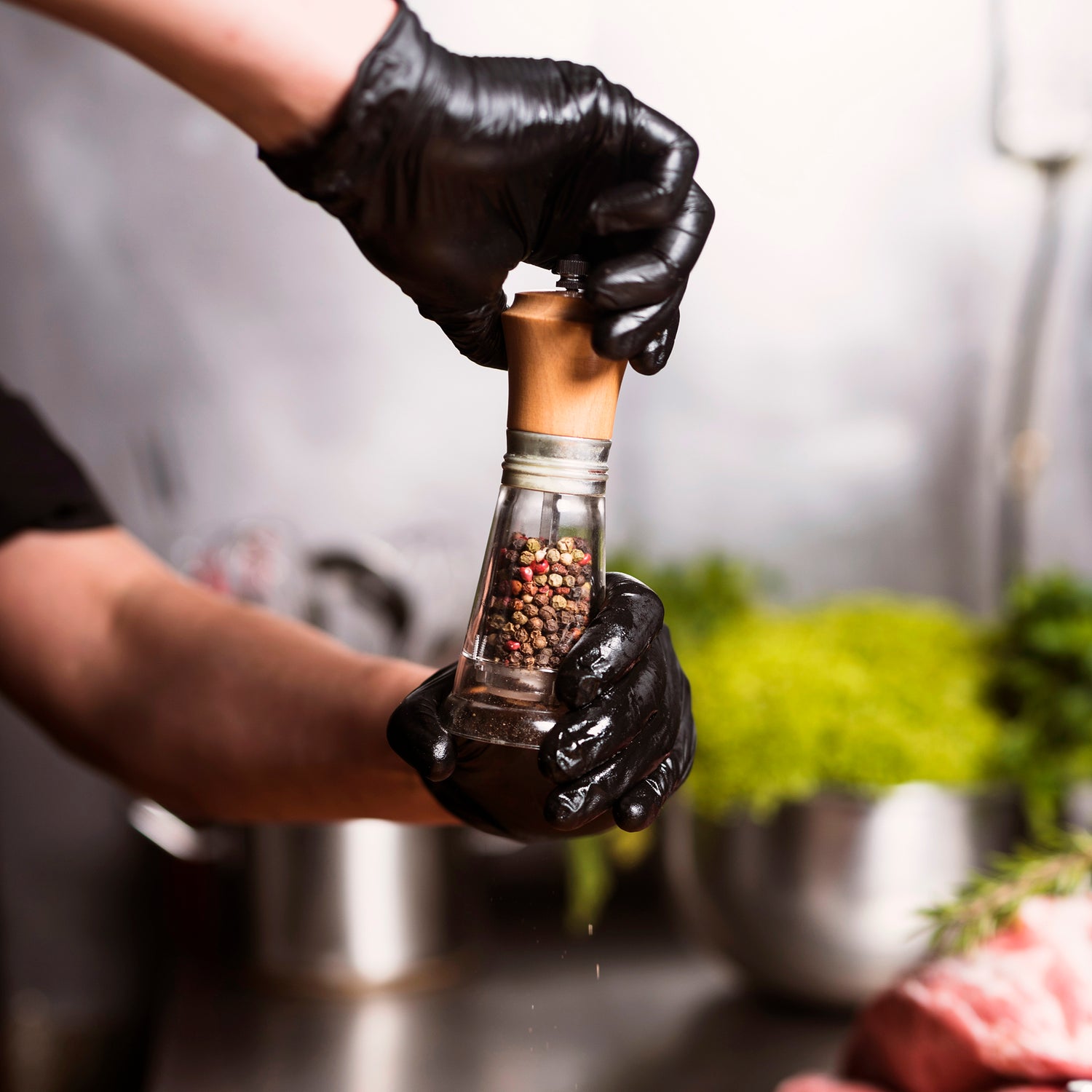 Our X-Large Black Nitrile Gloves are crafted to fit larger hands comfortably without compromising durability or protection. Made from premium nitrile, they resist punctures, chemicals, and oils, making them perfect for food preparation, cleaning, and industrial tasks. Latex-free and powder-free, these gloves provide safe, all-day wear for sensitive skin. The professional black finish complements foodservice and hospitality settings, ensuring a polished appearance. Available in packs of 100, these gloves are a reliable choice for restaurants, catering businesses, and janitorial teams.